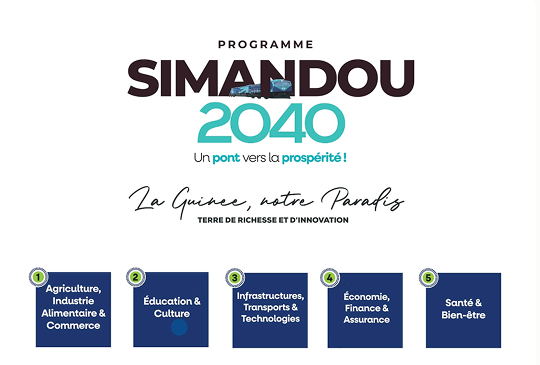 SIMANDOU 2040 est un programme de développement adopté par le Gouvernement Guinéen avec pour objectif de faire du pays une nation prospère et équitable. Il s'inscrit dans une vision de croissance durable et de gouvernance vertueuse, avec une attention particulière portée à la création d'emplois, à la promotion de l'entrepreneuriat, ainsi qu'à l'amélioration des infrastructures de base. Il est axé autour de cinq composantes déroulant la voie d’un développement durable et inclusif.